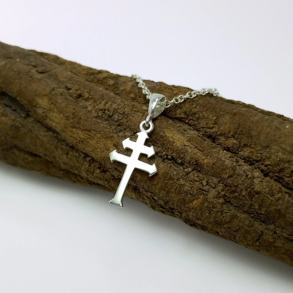 Possui um "braço" menor que representa a inscrição colocada na cruz de Jesus. Muitos quando desenhavam a Cruz ou crucifixo colocavam um pequeno traço em cima simbolizando a placa colocada quando crucificaram Jesus Cristo.