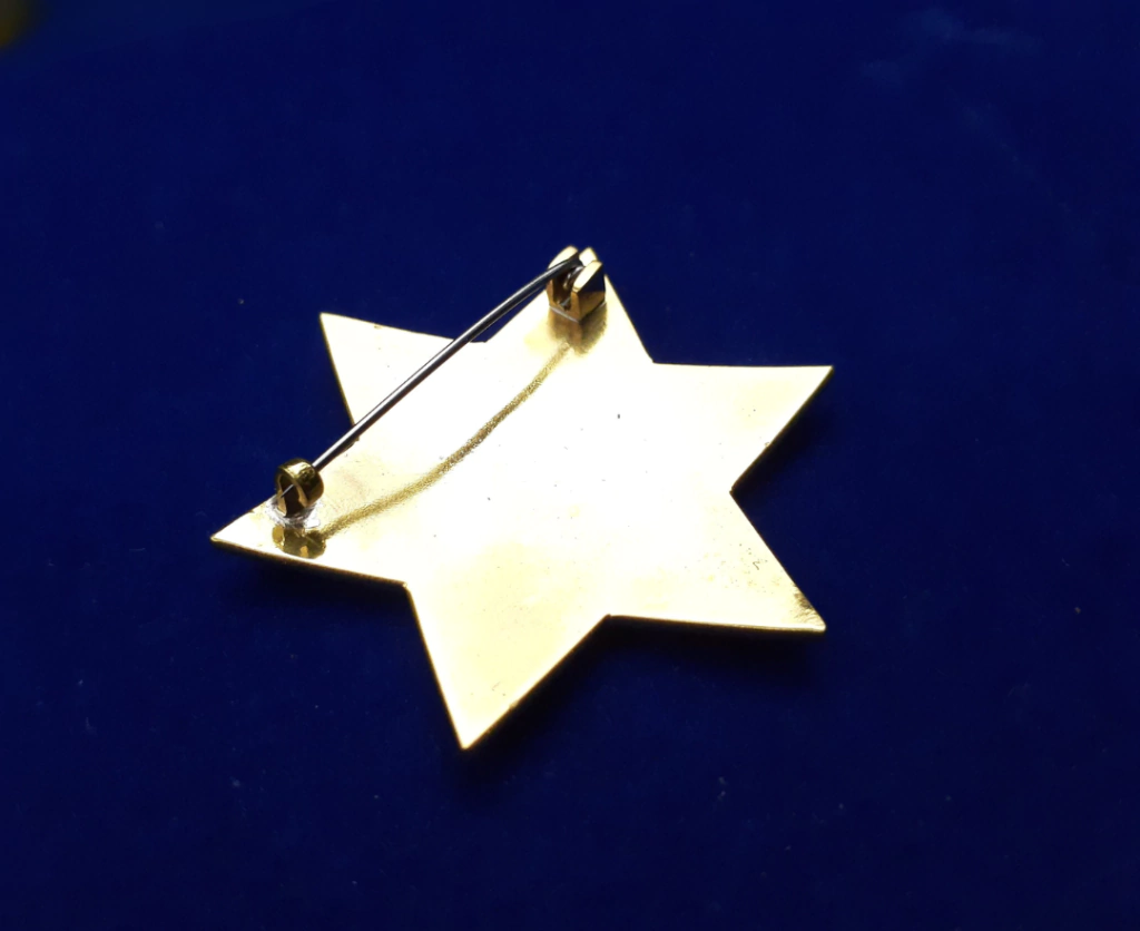 Com alfinete de aço e presilha de pressão.